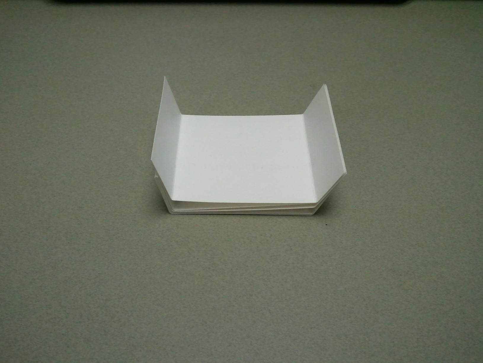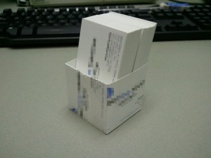 So, in the five minutes between interruptions, I made a small open-topped box out of my over-generous supply of business cards (nigh two full boxes for the two hats I wear at work, although one is unofficial now despite the official business cards). I got the idea from Jessica Jones who in turn got the idea from Ned Batchelder.