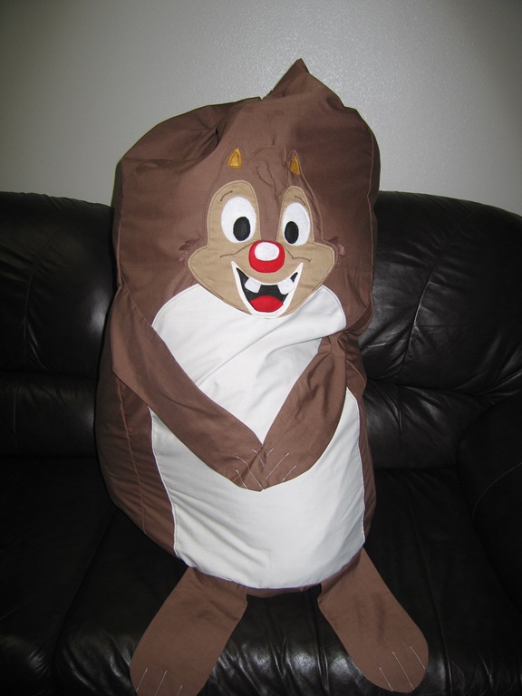 Originally, I set out to make a cute, chubby cheeked chipmunk for my only graduating senior girl, whom I’ve cared for since she was a wee jr. higher (tear). Anyway, it seemed fitting to me that she would get a fat-cheeked chipmunk, not because she’s fat-cheeked though. I drew a pretty good one on paper. But when I translated that into cloth, um…yeah. Not good. It…yeah. Scrapped that one and I looked for something easier to do still in the chipmunk range. That left cartoony chipmunks, which are stylized and easier to bring out with cloth, and what better cartoony chipmunks are there than Chip and Dale (Rescue Rangers!)? I decided on Dale, because he’s goofier and thought he’d look nicer as a laundry bag than Chip. I’m rather pleased with how he turned out. Even my mother immediately recognized it was Dale. This…may mean…that I watched waaaay too much TV as a child.