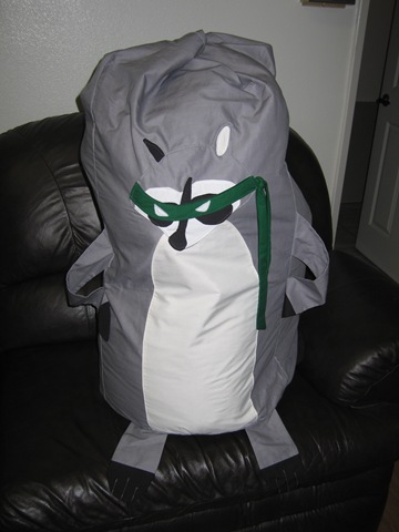 These were stuffed with a giant body pillow and my comforter for pictures. They’re still a bit floppy on top. Like I said, they’re big. I don’t have pictures of the kids actually inside their bags this year. I intelligently forgot to bring my camera with me the day I gave it to them. They also all have grommets and drawstrings at top to close, which you can’t see because the top was too floppy.
