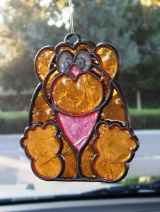 In the end, I didn’t use the suction cup they provided, and just strung my suncatcher on some invisible thread and strung it over my rear view mirror.  Huzzah!