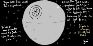 First of all, I would like to comment that you really ought to know what the Death Star looks like already. If not, I charge you to go watch Star Wars right now. The last three episodes is quite sufficient, though if you would like to watch the first three as well, I suppose I won’t disagree. I really do prefer the last three, though. But that is besides the point. For those who have no idea what a Death Star looks like, I have graciously drawn a very striking likeness. May I present below:
