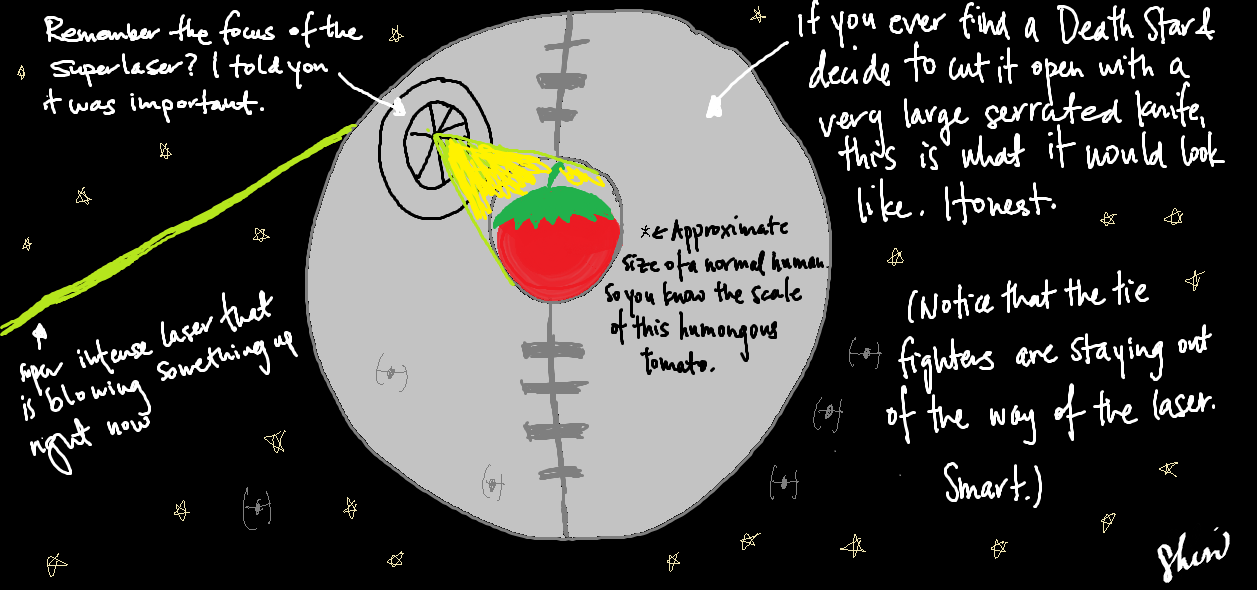 So Moose and I were discussing the subject of laser tomatoes and their uses–well, more like we were tweeting back and forth the uses and functions of the tomato for lasers–and I decided that the Death Star has a very large tomato in the midst of it. It makes very obvious sense, does it not? For the very largest superlaser, only the very largest tomato will do. Anyhow, Moose was telling me that she was going to write a two-part post on the laser tomato, but I felt that a two-part post was quite insufficient and a Post the Third would be necessary to make it feel like a complete whole. After all, she does post three times a week, you know. For Moose to only put up a two-part post for a three-posts-a-week-blog seems… outlandish. Or something.
