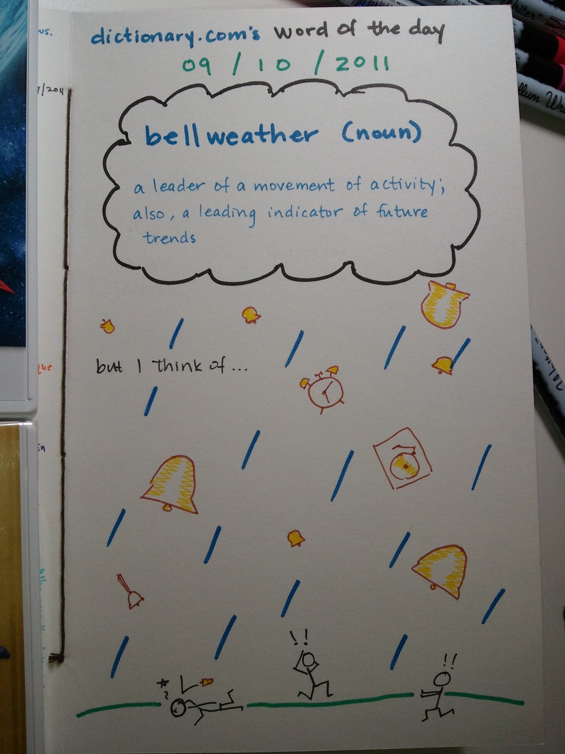 SO ANYWAY, that’s how I got my word of the day. Complete with the definition. Tada. Upon looking at it closely, I may have misspelled it. I think believe it’s supposed to be “bellwether” not “bellweather.” I seem to have added an “a” due to the influence of my overactive imagination. I should probably try fixing that. Huzzah.