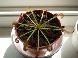 This is Mr. Tentacles. He’s a sundew. Specifically, he’s a Cape sundew (Drosera capensis). I got him along with a Venus fly trap who is still unnamed (suggestions, anyone?) a few months back.