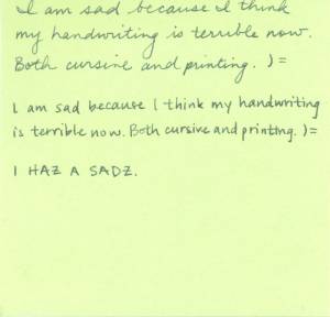 Oh, and something else I’ve learned along the way is that I may not be able to use a fine point pen when writing in cursive. My cursive would probably improve if I used a medium point pen. That’s actually something I already suspected and it’s kind of nice to have some confirmation, I guess. I’m also not entirely sure if I’ll continue to cultivate my cursive hand. I may just switch to italics. We’ll see.