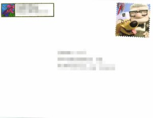 This letter is going to California via nothing. That’s right. It’s a real letter that I’m sending to a friend because I write letters to my friends sometimes. It’s not a swap, it’s not postcrossing, it’s a real letter. Gasp! Unfortunately, it’s also not that exciting to look at. It’s just a normal, white envelope. I did some stuff to the back, but I’m too lazy to scan and process it now. It’s a been a long day. Besides, you don’t really need to know what I did to the back.