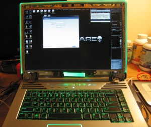 I took the front bezel off of LeeEv because I had finally, FINALLY gotten around to ordering parts to fix the hinge mounts. As you can see (by the logo that is also the power button), LeeEv is an Alienware laptop. Specifically, he is an m15x circa 2009, pre-Dell takeover. I have to say, his innards are marvelous. And that screen is wonderful. I really like it. But I also have to say that his mechanical design SUCKS. Big time. It’s like the design team spent all their time trying to think up expensive parts to put inside the machine and make the outside LOOK nice, but function like…not well.
