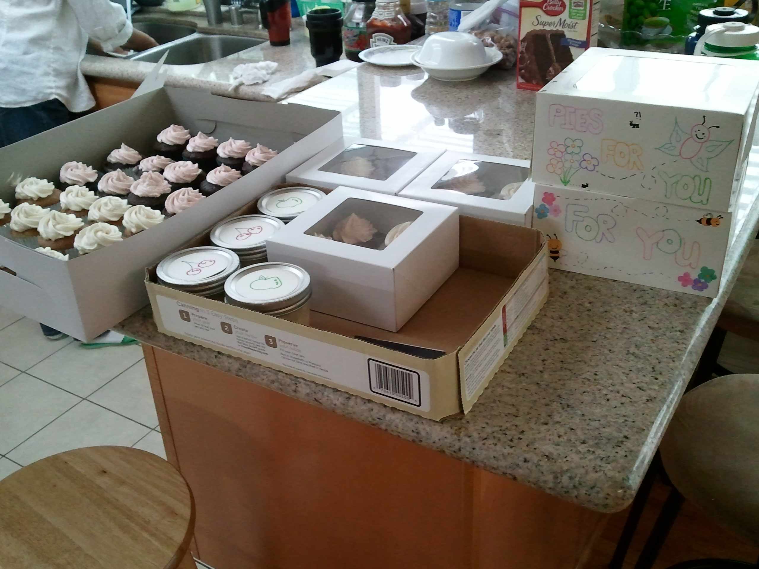 In case you’re wondering, I made them spice cupcakes stuffed with maple whip, chocolate fudge cupcakes stuffed with strawberry whip, and the bosses got cherry and/or maple apple pie jars.  Grampaw and FSB got the boxes of pie jars.  The rest of the bosses got singles.  I…hope they came out ok.  I was so sleep deprived when I was making these.  It…could be really bad.