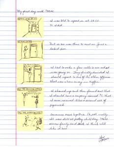 Here’s a brief, illustrated recap of what happened to me on Monday. Also, you have a sample of my handwriting, which I haven’t specifically been practicing, but it has been looking fairly decent of late.
