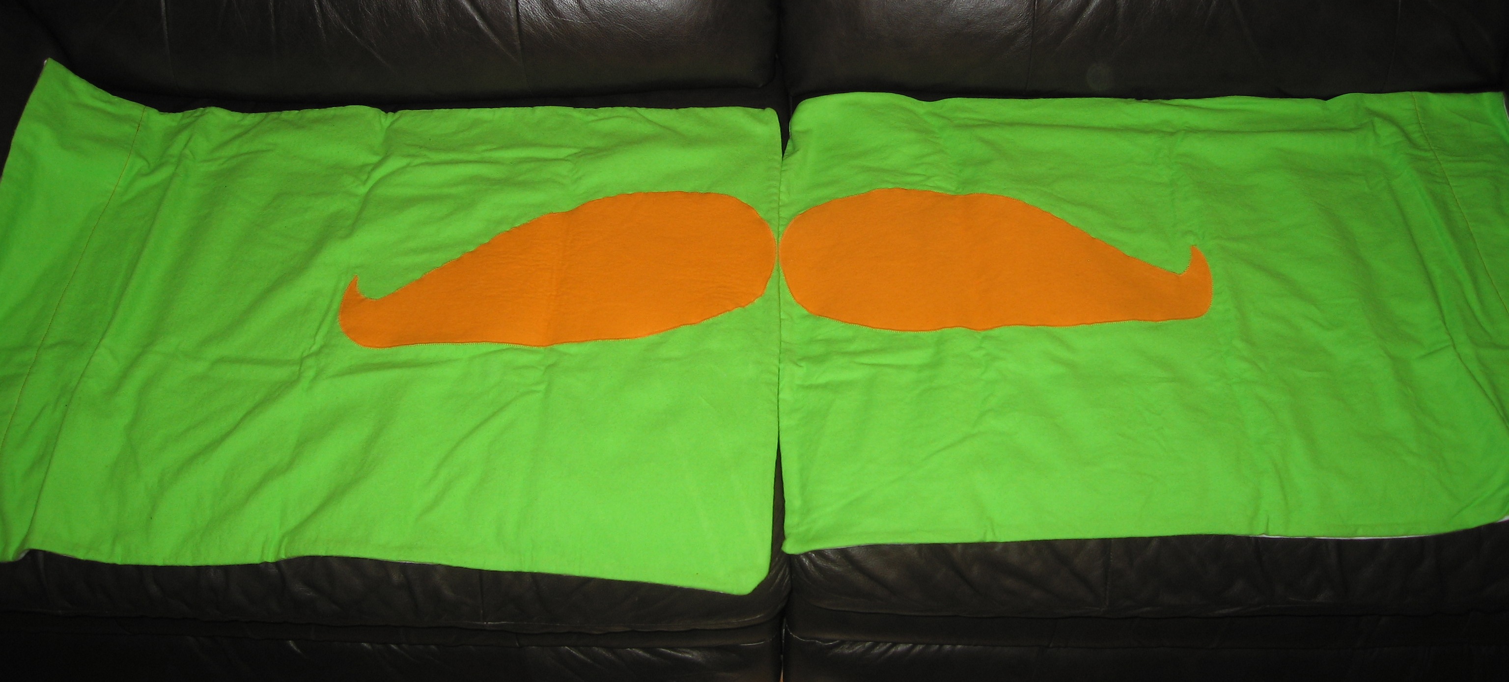 Hmm…like I said, the pillowcases are made with flannel.  Mustaches are appliqued (appliquéd? appliquéed??) on.  I drew the mustaches on directly on fusible interfacing with the help of some of my large circle templates and then the ironing and cutting and sewing.  I’m rather pleased that this project help me use up pretty much all of my bright orange thread.  It was left over from the propeller mushroom.  Also, I used up all the bright orange bias tape I had, also from the propeller mushroom.