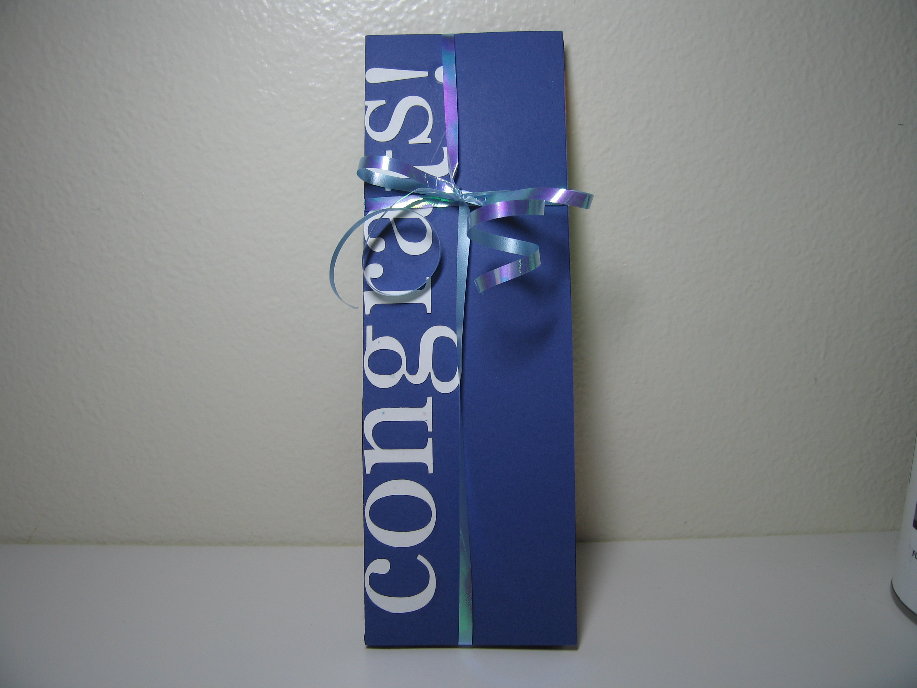 Erm…the card was made with blue cardstock (obviously) with a creamy, bespeckled white cardstock (not as obvious).  I kind of regret using the bespeckled cardstock for the lettering because most of the speckles didn’t end up in the letters.  The few specks that did kind of ended up looking like accidental marks.  Oh well.  Overall, I’m quite pleased with how the card turned out.