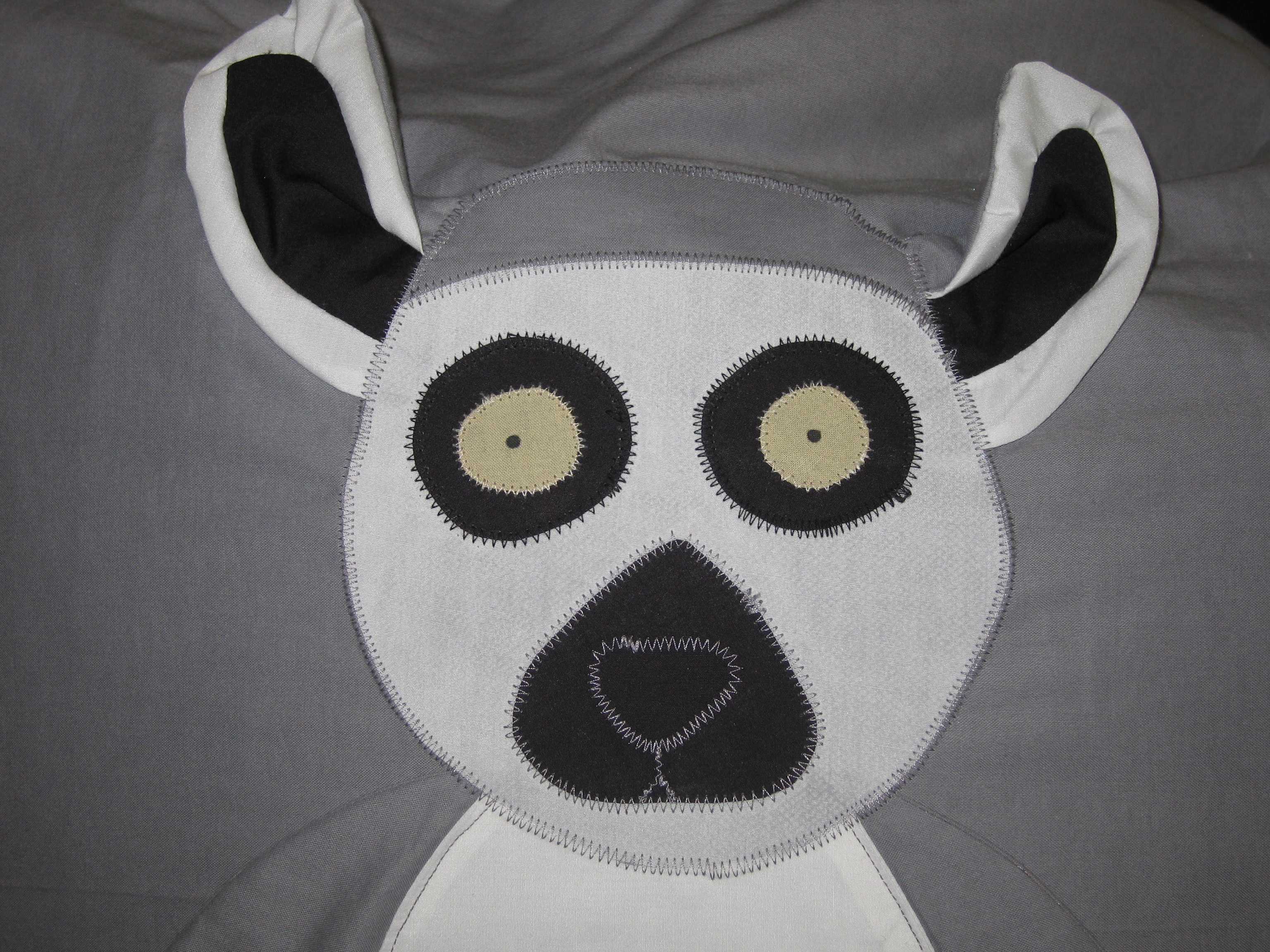 I really like how the hands and feet turned out. It was actually the same pattern for both. Lemurs have hands and feet that look quite similar. I sewed the general outline of the hands/feet and made the individual digits by using black thread with a gray bobbin. Really like how it turned out. In case you didn’t catch it the first time.