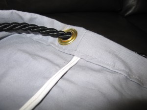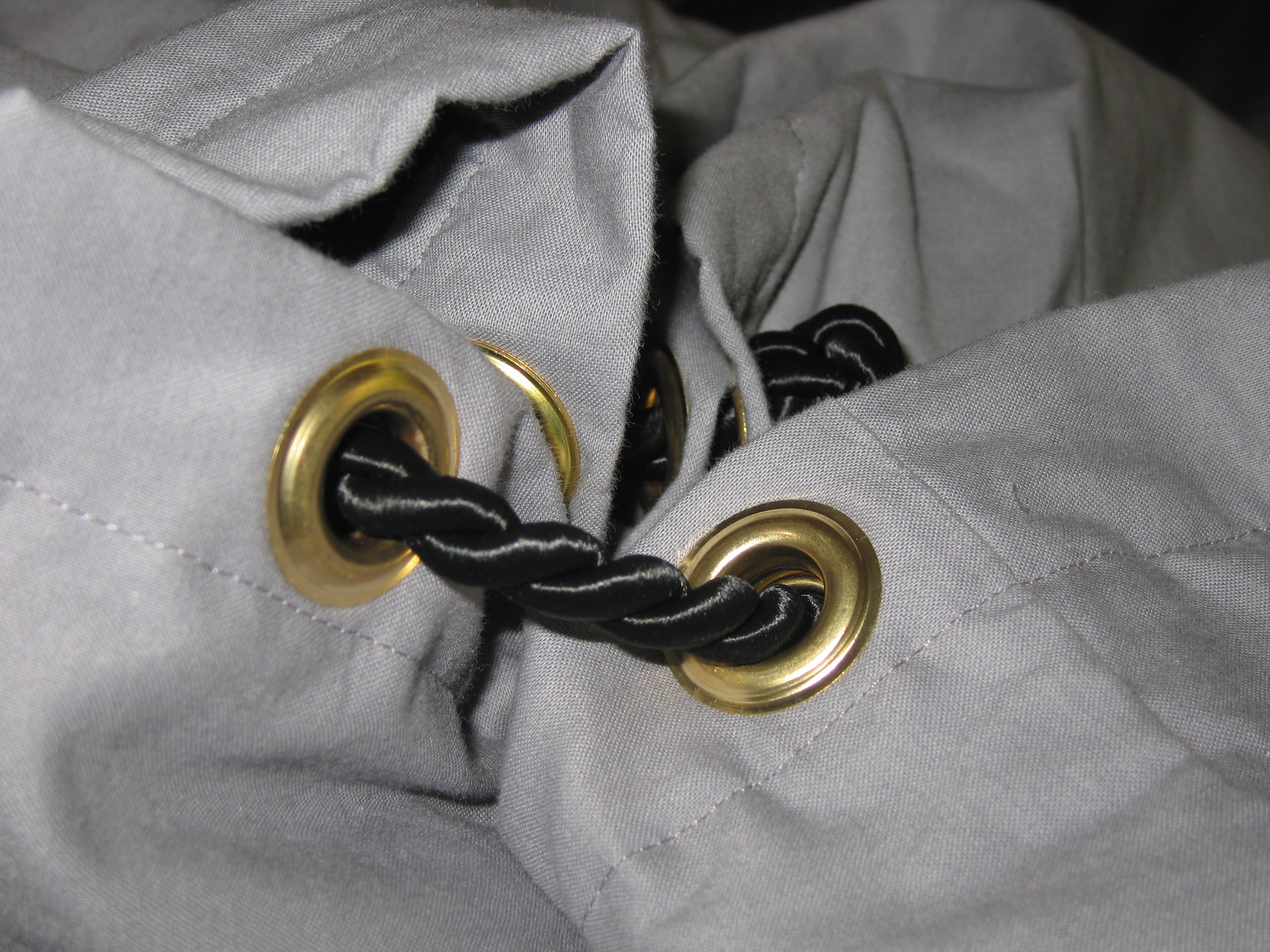 And finally the grommets. I had originally planned on using silver grommets, except then I realized I only had two left. I did have a new box of gold colored grommets, so I started using those. Only to have each and every one I tried putting fail at the last instant. They would all warp in weird ways right at the end and not actually grip the cloth. I thought it was the anvil and setting tool I was using, as I had two sets, but both sets were producing the same results. I ended up having to buy another set with another setting tool and anvil. These ones worked just fine. I have no idea what was going on with the other grommets I had.