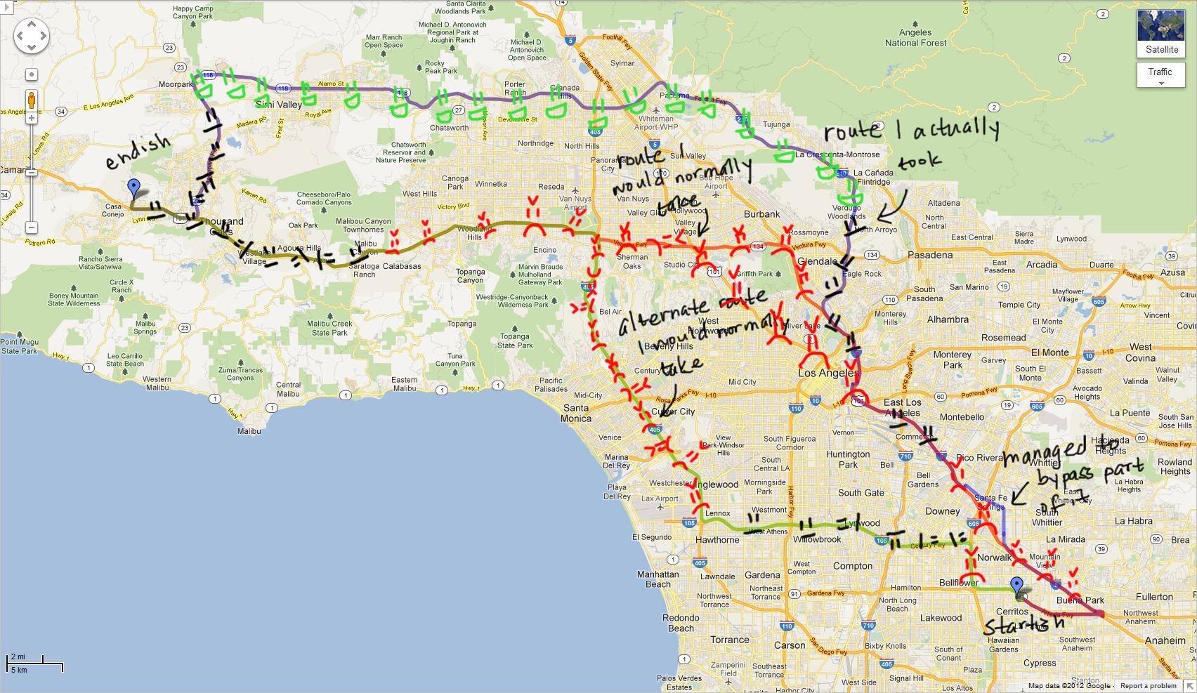 So, here’s the route I took: from startish (which isn’t really where I started because I left from home, but it’s where I start counting mileage), to the 91, to the 5, got off at Norwalk, got back on at Lakewood, to the 101, which I IMMEDIATELY regretted because that was going to take me through DTLA and I have no idea why I got on the 101 to begin with because I knew it would be crowded, got off at Fourth, got back on the 5, to the 2, to the 210, to the 118, to the 23, to the 101, and finally endish.