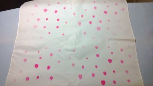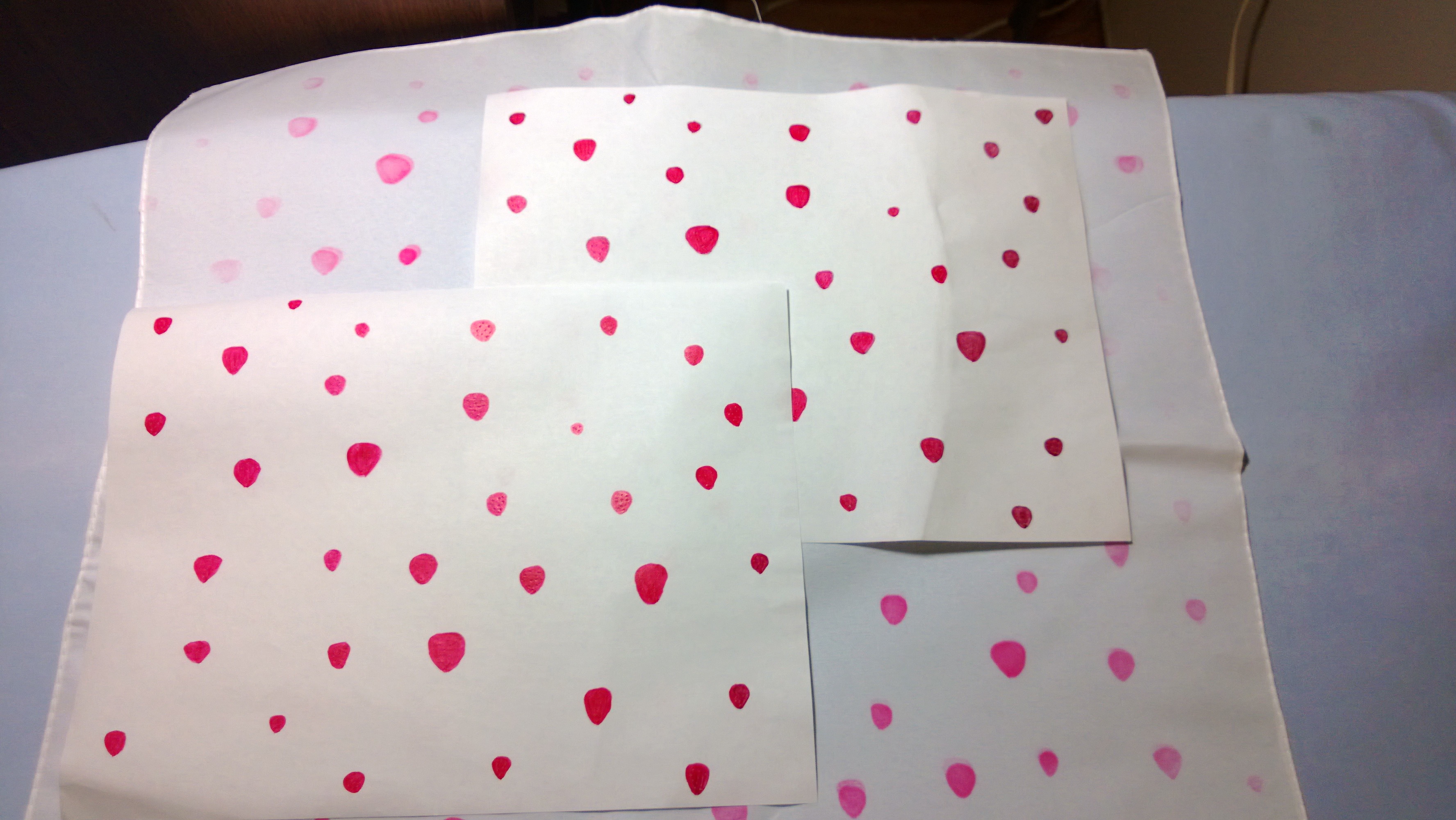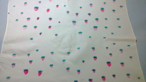 It turned out better.  I got the hang of it as I did more sections.  The upper right quadrant is still kind of faint.  And there’s a small issue of ghost strawberries.  Oh well, it doesn’t bother me as much as I thought it would.  Maybe the idea of ghost strawberries is just too funny to me.  But if you don’t want ghost images, obviously don’t transfer onto an area more than once because odds are overwhelmingly that you won’t line everything up the same way and you’ll get ghost images.  Just press firmly the first time around and move the iron slowly across the area.  I found that it worked better than trying to cover the whole sheet of paper at the same time.  Spend about 30s over each iron sized area of the paper and the images transfer a lot nicer.  A had a few strawberries that even showed the pin hole seeds that I painstakingly poked into each strawberry.