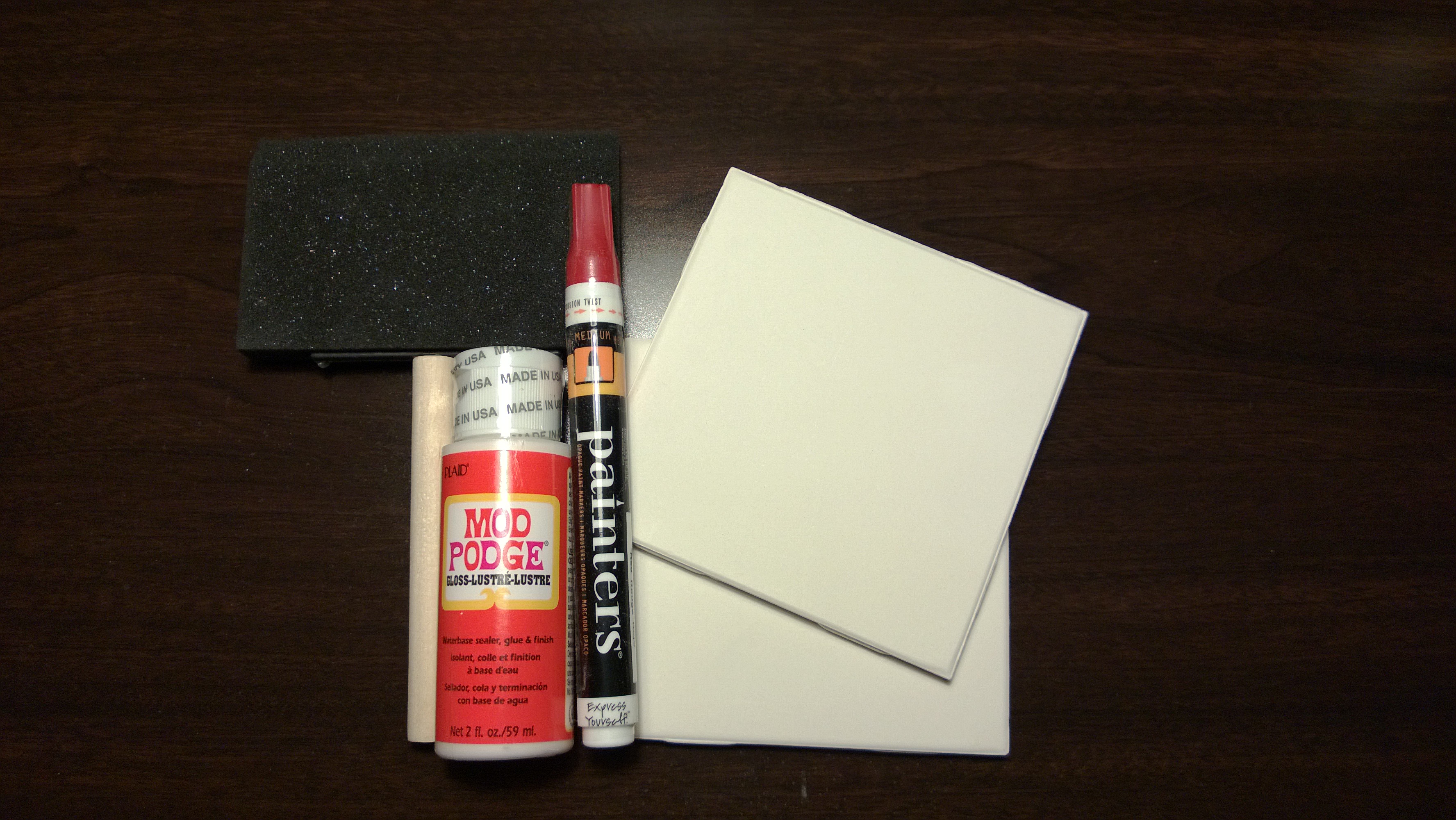 The contents of the box included two unfired tiles, a small bottle of glossy finish Mod Podge, a paint pen, and a large foam brush.  I don’t remember what the advertisement was for this month.  There actually might not have been one.