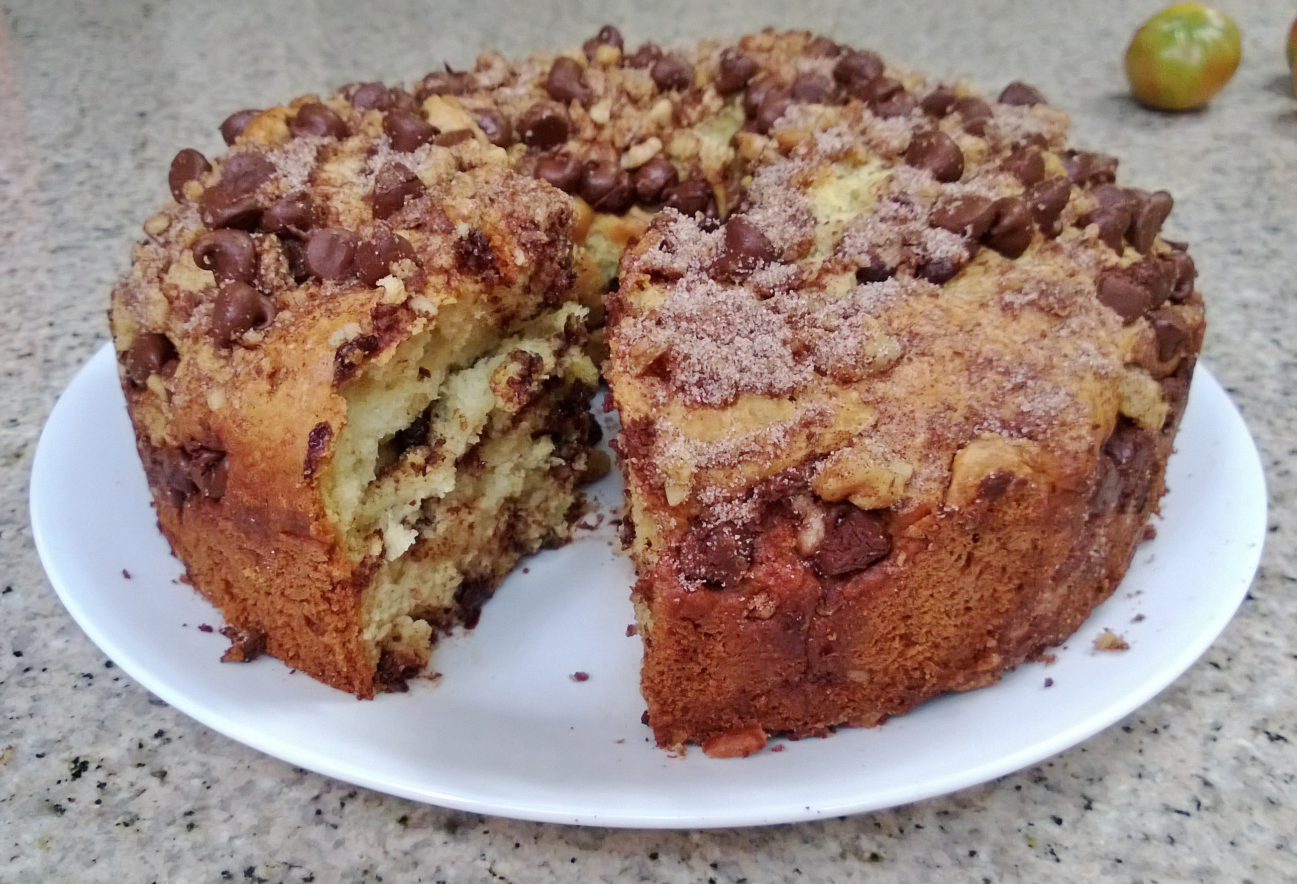 It is quite good. Of course, I’m a fan of chocolate and walnuts and cinnamon, so I’d be hard pressed not to like this coffee cake. Also, I’m a big fan of coffee cake, since it goes so well with coffee.