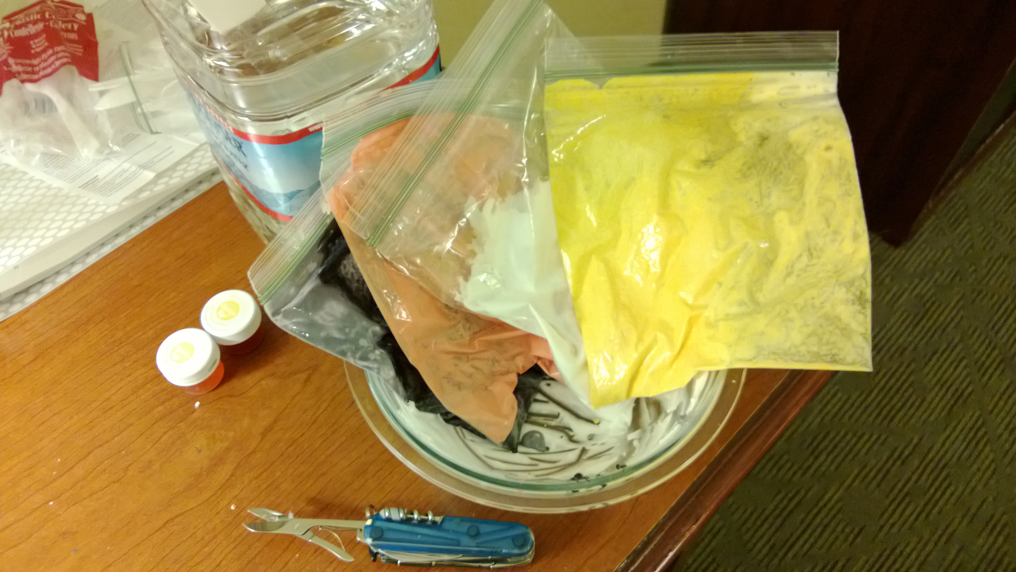 I made the icing entirely by hand. I bought a small mixing bowl, a really dumb whisk, meringue powder, powdered sugar, and gel food coloring and made a half batch of icing and dyed it all the colors I needed. I travel with plasticware, small plates/bowls, and ziploc bags so that helped. I also normally buy a gallon of drinking water the first day, so I had that on hand too. My arms are surprisingly not sore from beating icing.