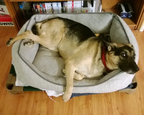 She likes this particular bed so much, it’s gotten to the point where she has difficulty making up her mind if she wants to sleep in her car bed, which I’ll leave outside in the living room when I’m working at home, or if she wants to be close to me and sleep in her cot or in her office. So she’ll go over to her car bed and lie down, but then decide she’d rather be closer to me and go into her office or something, but then miss the comforts of her car bed and go back over to her car bed, but then decide she really would rather be closer to me and come back inside to her office or her cot. This repeats until I give in and bring her car bed inside where I’m working and she’ll plop right down and sleep.