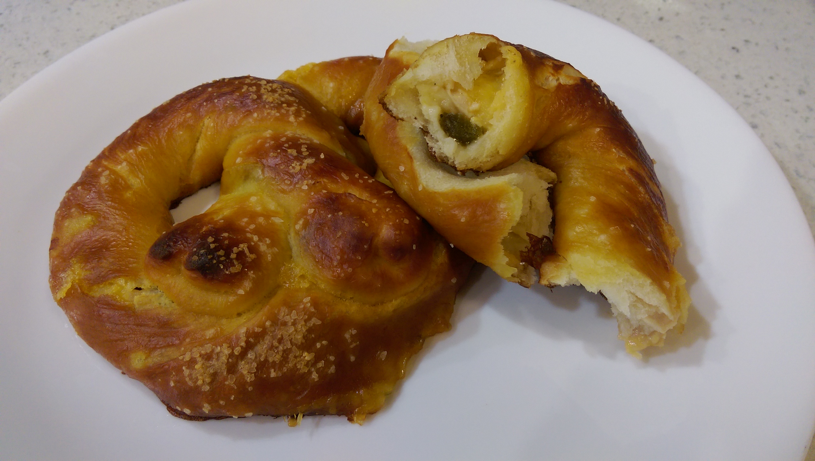 Now the pretzels, I liked those quite a bit. This also ended up being another thing that same coworker sent me. And again I was inspired to make them. I ended up substituting out the Swiss and ham for cheddar and turkey because that’s just what I had on hand. I did have jalapenos though. Mostly because I like cheddar jalapeno focaccia. I didn’t have poppy seeds, so there’s none of that. And I used kosher salt on half of them as a garnish. I didn’t think it was necessary. Pickling salt would have looked better, but again too much salt and unnecessary.