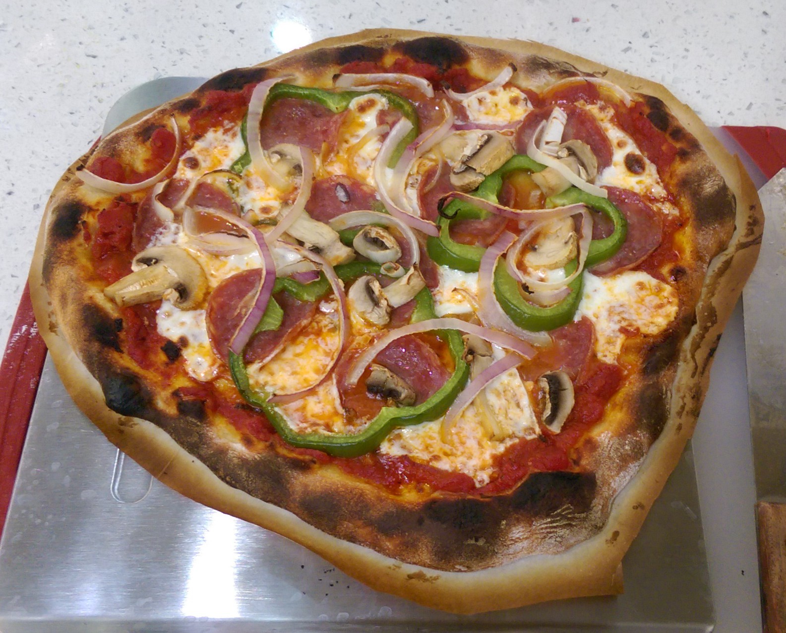 - Toppings were a reduced jarred marinara sauce, fresh mozz (because I had to get rid of it, but I would definitely use an aged mozz next time), some type of salami, green bell, red onion, and button mushrooms.
