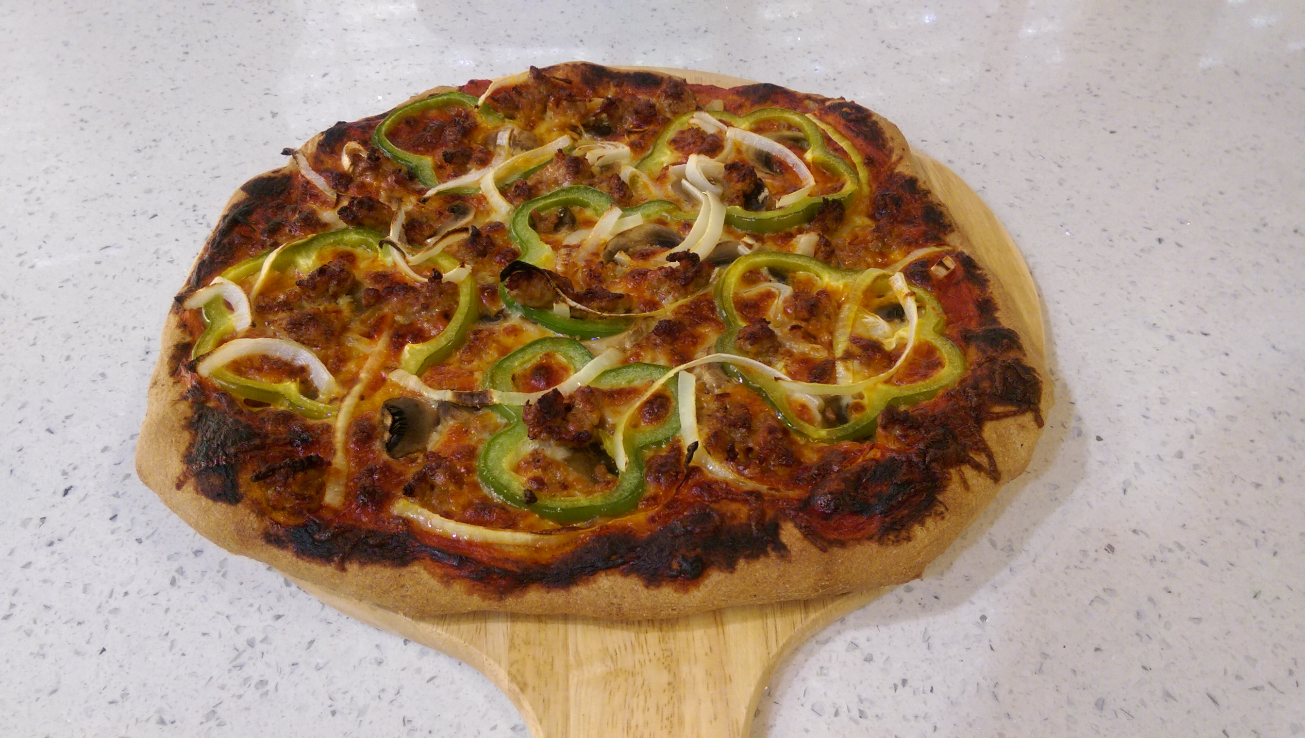 The normal pizza was pretty good.  There’s a nice char at the edges, the crust is light and fluffy as yeast risen crusts are, but it is lacking the chew and the crispness of a more refined flour.  The bran might have made the dough easier to handle, but it also gets in the way of gluten formation.  So just like whole wheat breads are softer and don’t crisp in the toaster as much as a white bread does, the same goes with whole wheat pizza crust.  It tasted pretty good though.
