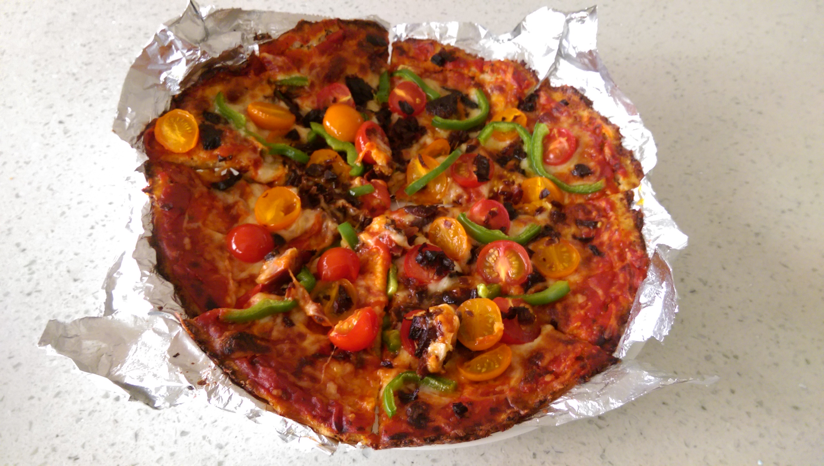 I think it’s well known that I really like pizza (and chocolate). So…recently I made another pizza. This time with a low carb/gluten free crust. No, I’m not jumping onto the bandwagon of low carb/gluten free. Yes, it is a bandwagon. I tried it because I had to get rid of some cauliflower and I found this recipe that uses cauliflower (among other things) for the crust.