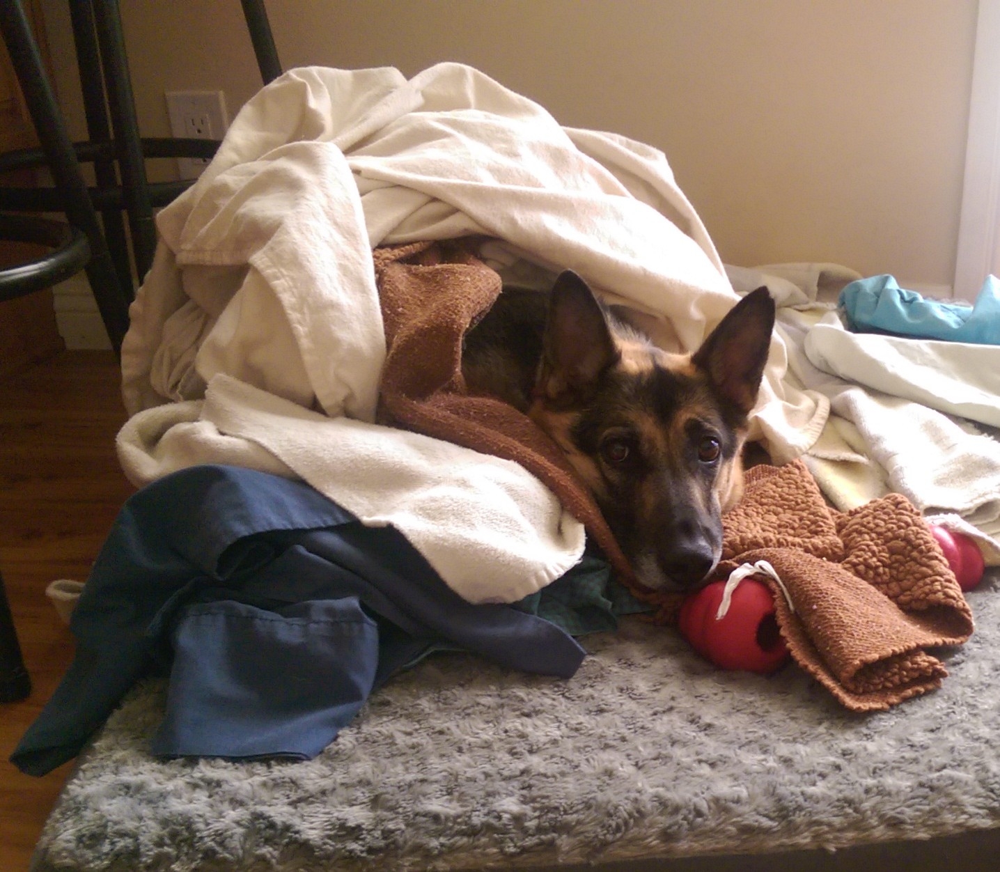 The other day, I did the dogs’ laundry. They do not like to do it themselves. They are jerks. Anyway, when I took it out of the dryer, Yaris volunteered to fold everything for me. But by folding, she meant burrow into the blankets and take a nap. Even though she is ridiculously furred and it was 192873192837 degrees outside. She luxuriated in her nest for quite a while.