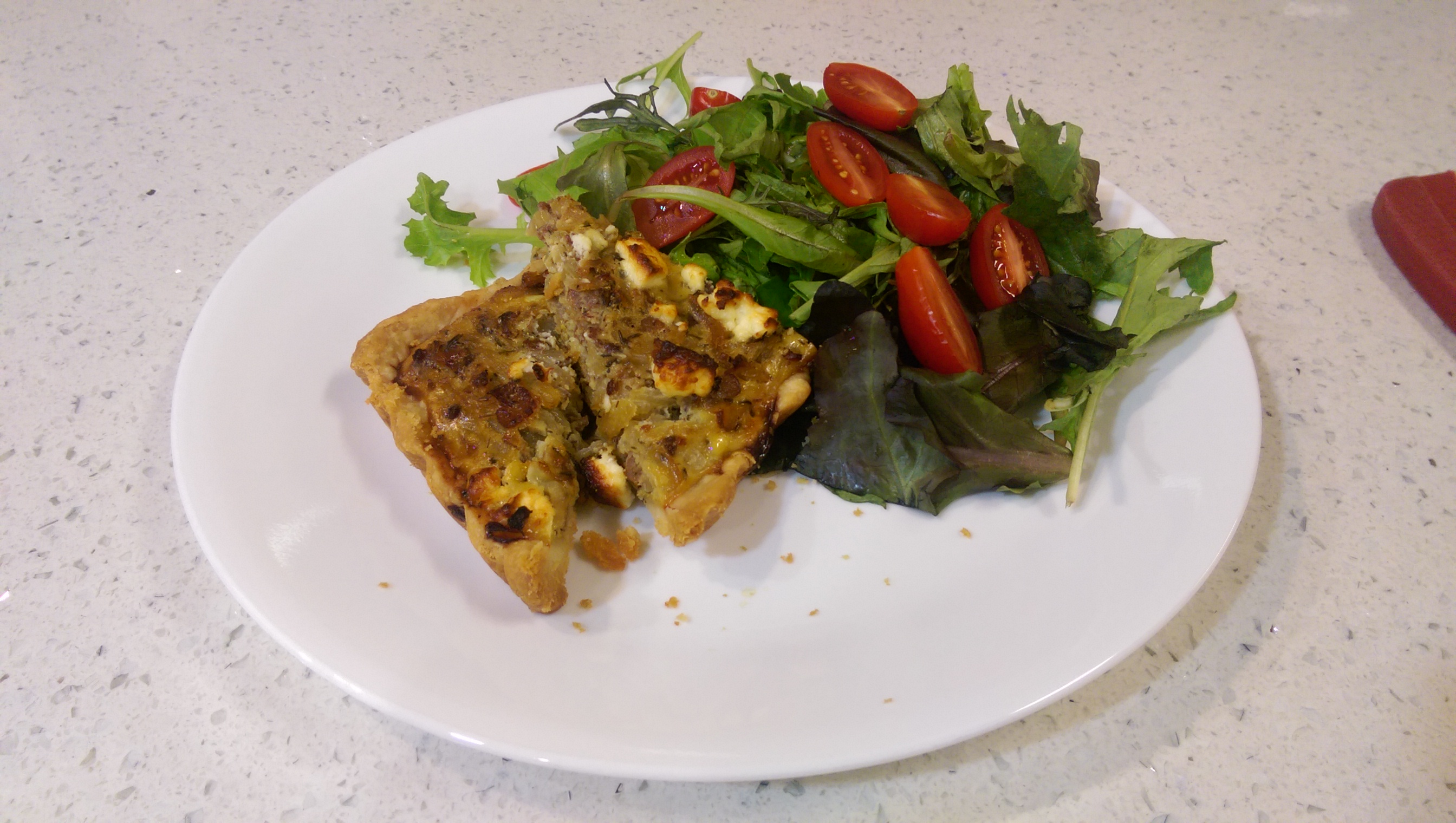 For a little more flavor, I did end up spreading a thin layer of whole grain mustard on the bottom of the crust before dumping the onion mixture in. And then as I was looking at it, I decided that I needed something to bind the filling together, so I whisked up two eggs and poured that over the onion mixture. And then I remembered I had some sheep’s milk feta still in the fridge and that would go well with everything already in the tart, so I crumbled up about 2oz of that and sprinkled it over the top. And then I finally put it in the oven at 425degF for about 30min before I ended up throwing half the contents of my fridge on top of the tart.