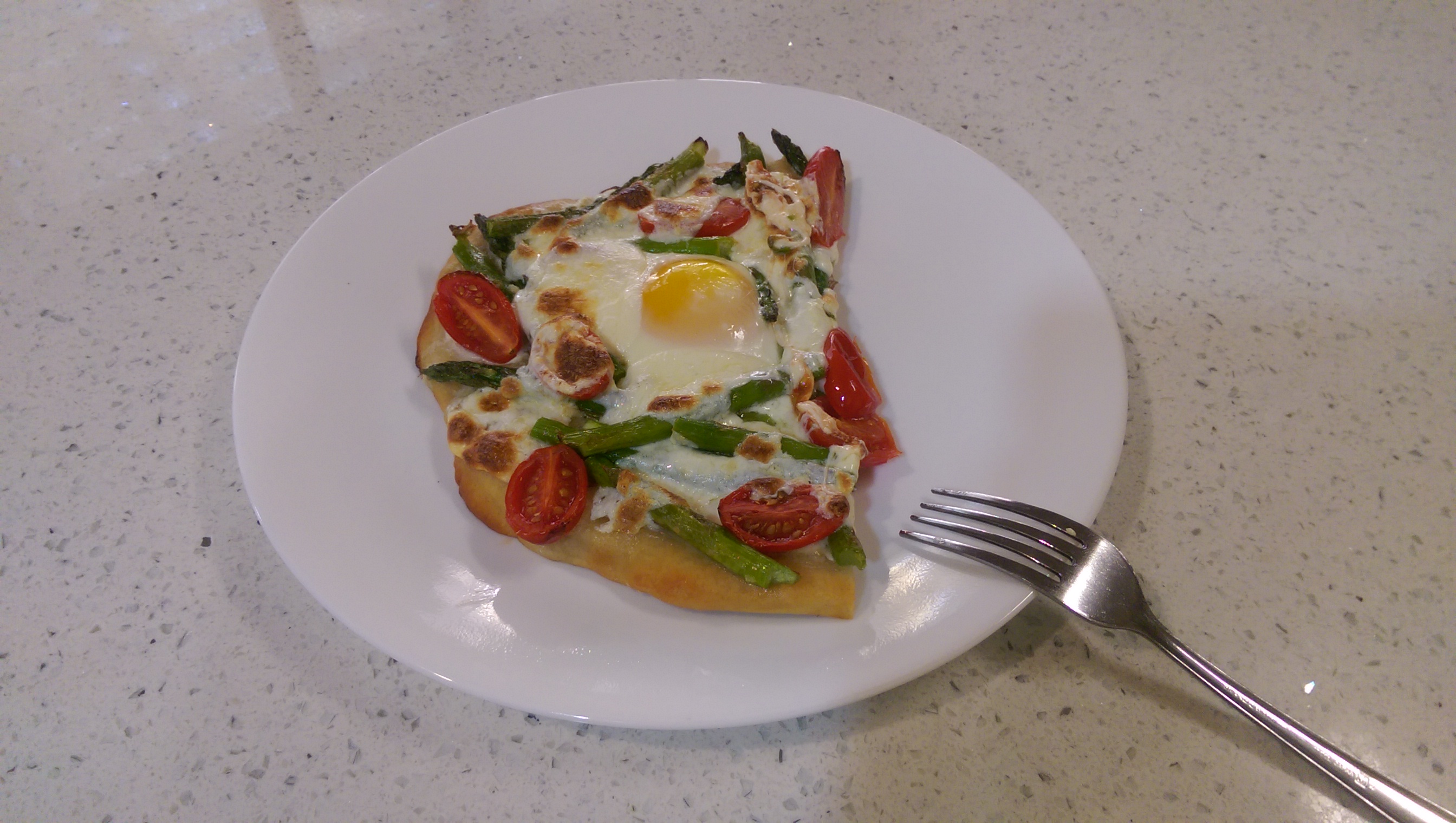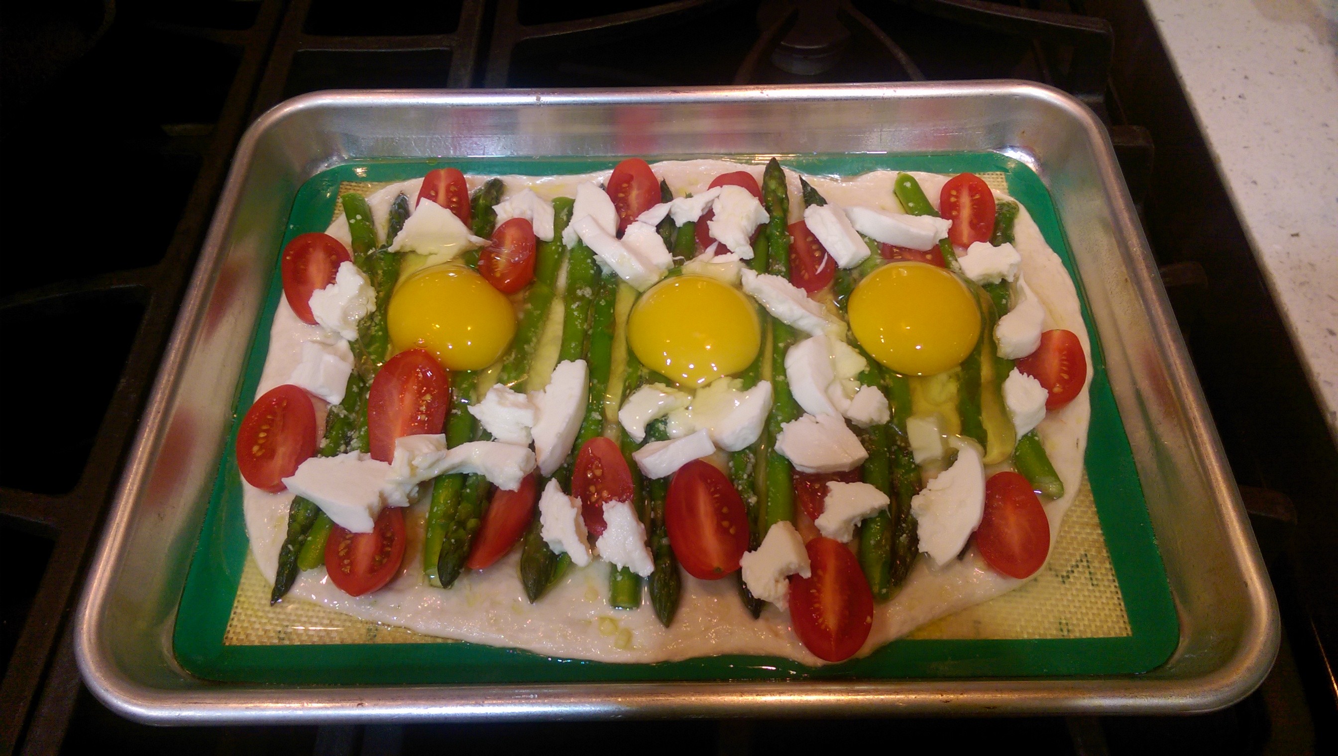 Thus, I recently made a breakfast pizza consisting of a garlicky olive oil, fresh asparagus tossed in that same garlicky olive oil and some grated parm, grape tomatoes, fresh mozz, and fresh eggs cracked on top. Why? Because I had all of that in my fridge already as well as pizza dough and I needed to get rid of some of it. Also, pizza. Duh.