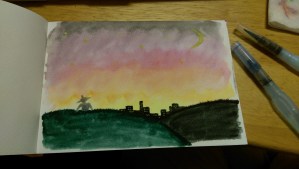 You remember the travel watercolor palette I purchased for myself as a self-pity gift? I’ll play with it from time to time when I need to take my mind off of things. Here’s a robot watching the sunset. You know, as they do. I have a tendency to put robots in things when I’m making stuff not related to a project.