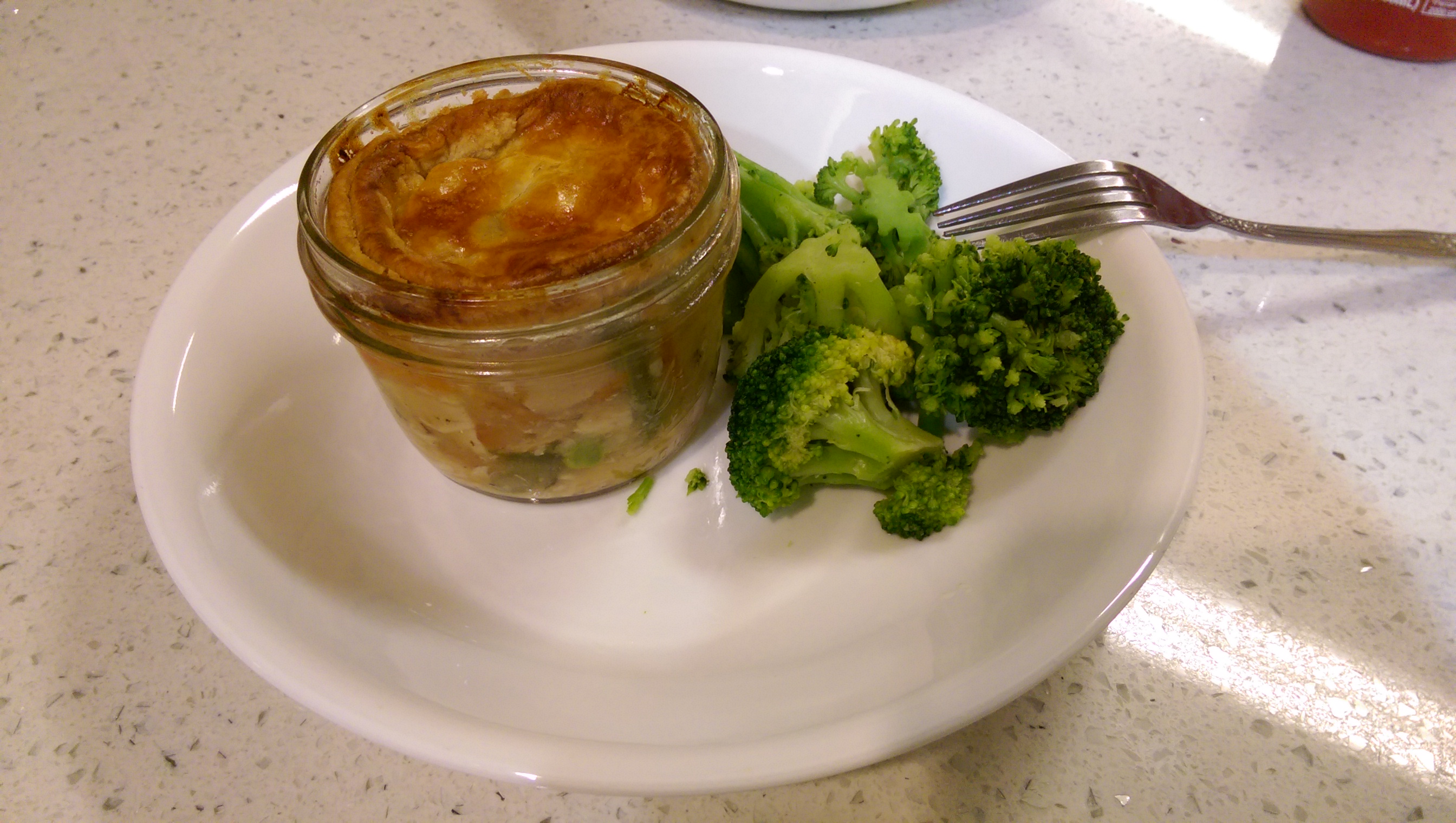 The filling was all the chicken I had left over, random frozen vegetables, some butter and flour to make a roux, random spices I had on hand (thyme maybe some poultry seasoning, salt, pepper), and chicken stock.  I heated that through to make sure the sauce thickened and then distributed it evenly to 7 jars.  The crust was provided by my now defunct local Fresh and Easy (tear).  I picked up some puff pastry at a discount in their final days.  I just used one of the lid rings to punch circles out of the puff pastry and tuck the circles in over the filling.  I topped them with an egg wash, let them cool completely, and then stuffed them all in the freezer.