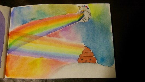 Anyway, painted this because my a-pushing friend has decided that gossip should now be called “unicorn poo.” And I immediately saw this imagery in my head. In watercolor no less. But with more glitter. I haven’t flirted glittered this one yet. Because gross. Glitter.