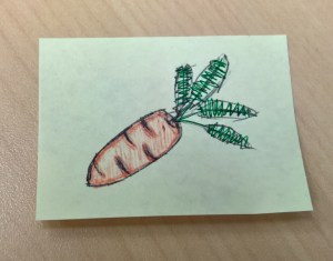 This carrot doodle ended up on 💄’s cube wall though.  It was just as quick doodle after lunch one time with a ballpoint and maybe a gel ink pen?  I forget exactly.