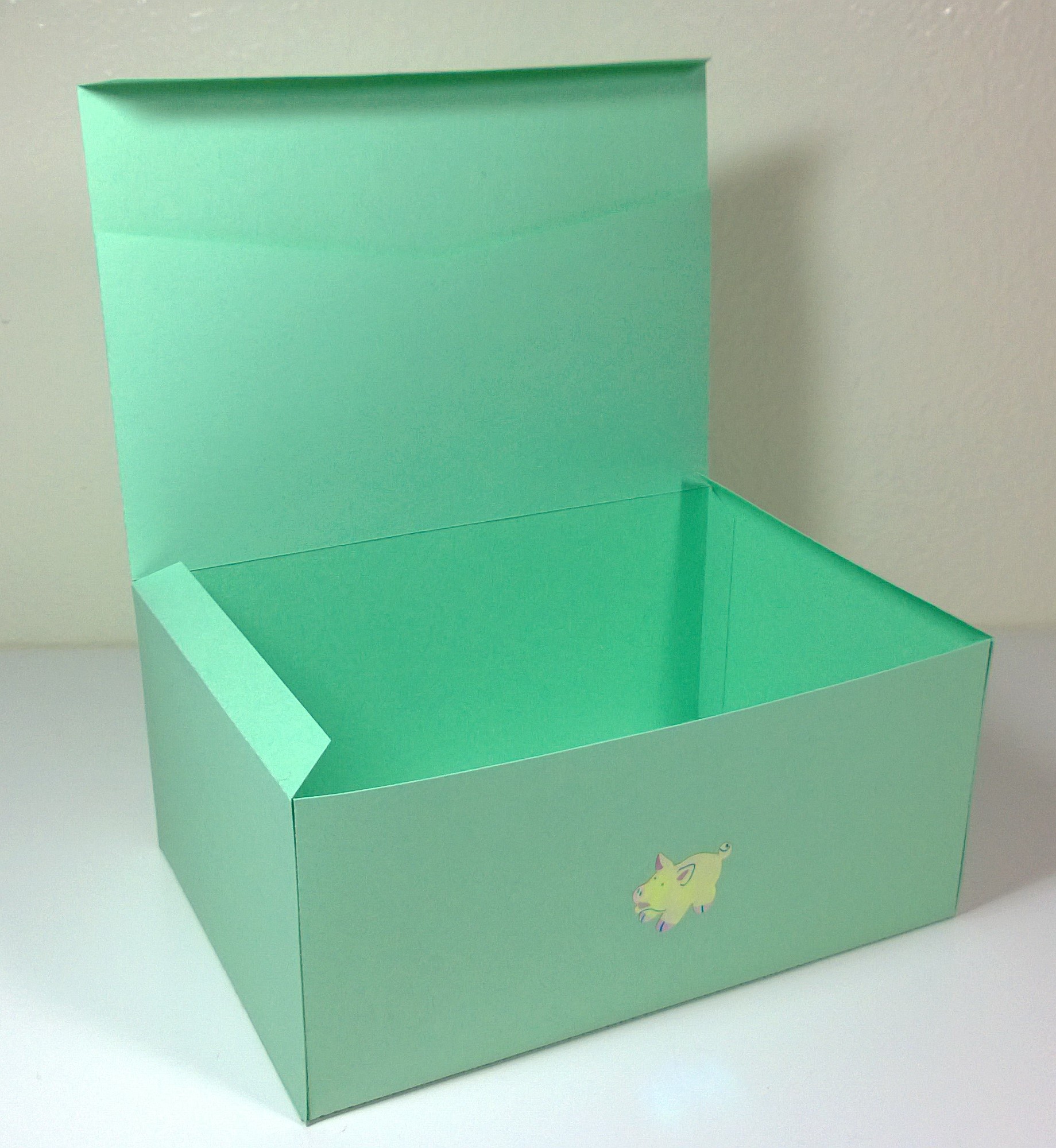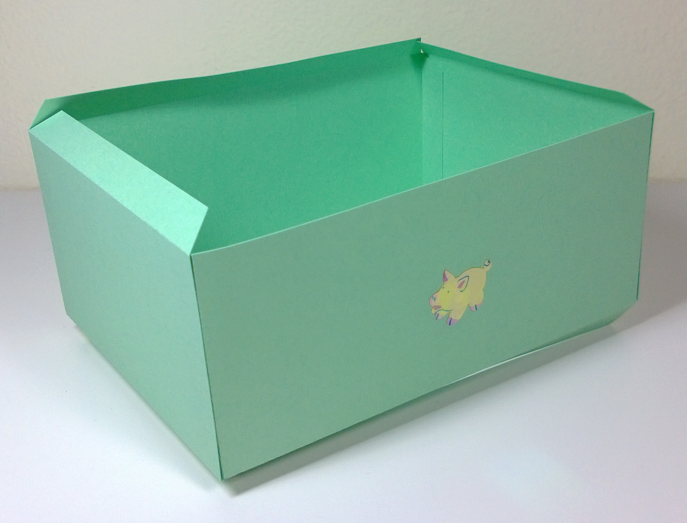 - Glue the bottom onto the assembled side walls. The bottom is the side with four flaps. I glue the bottom piece on the outside of the carton to hide the flaps. You can glue the bottom piece to the inside as it is cut slightly smaller than the perimeter of the carton for said reason (and also to reduce the number of sheets of cardstock you would need to use for this project). Because I glue the bottom flap onto the outside of the carton, I find it easier to put glue around the outer 0.25″ or so of the bottom piece and then stick the side walls onto it.