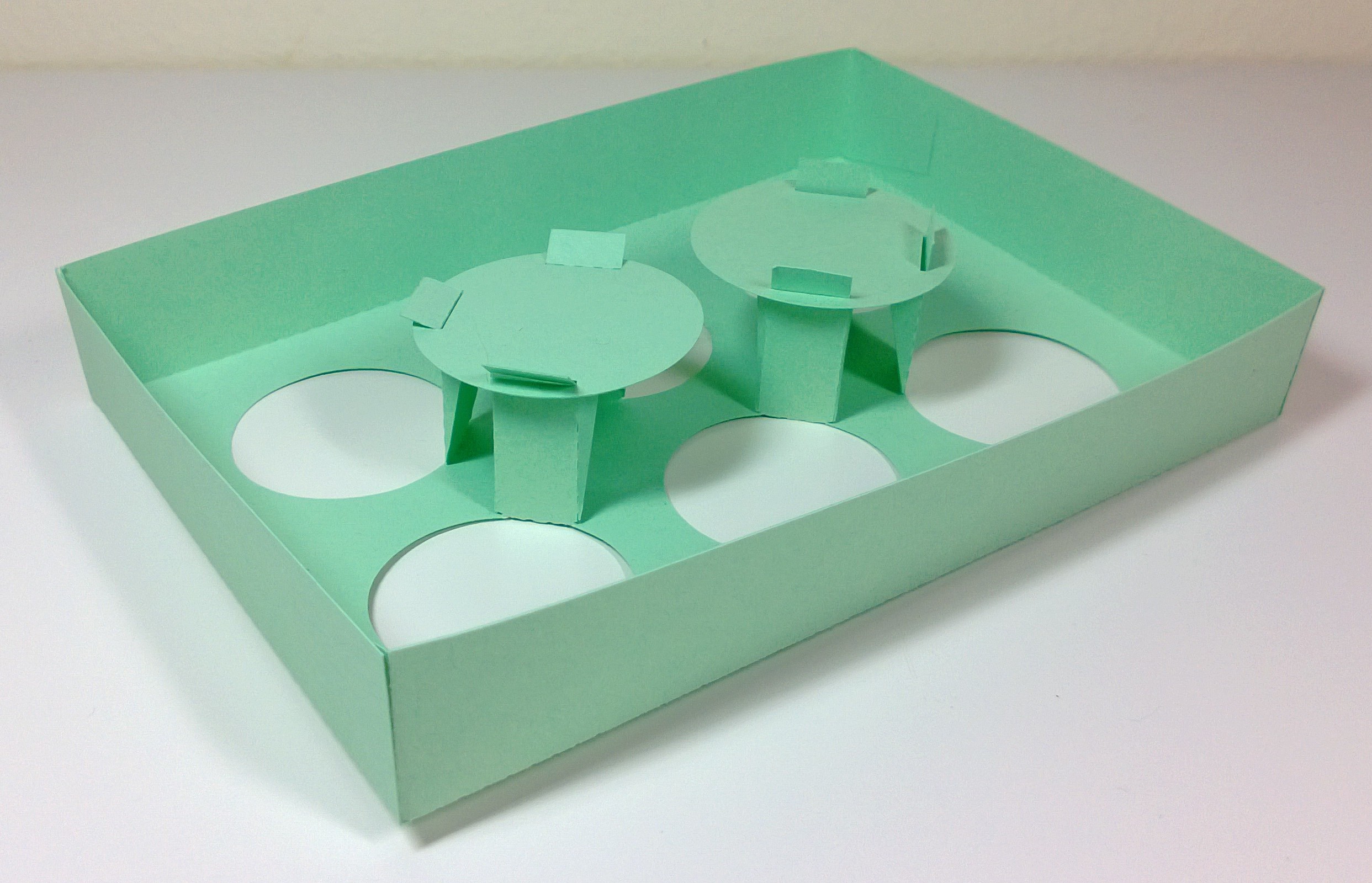 Well, I have a Silhouette. It makes cutting weird shapes really easy. So I quickly came up with a box shape and an insert for the eggs. There are two little pedestal things that you fold underneath the insert to keep it from buckling under the weight of the eggs. Tada! Paper egg carton!