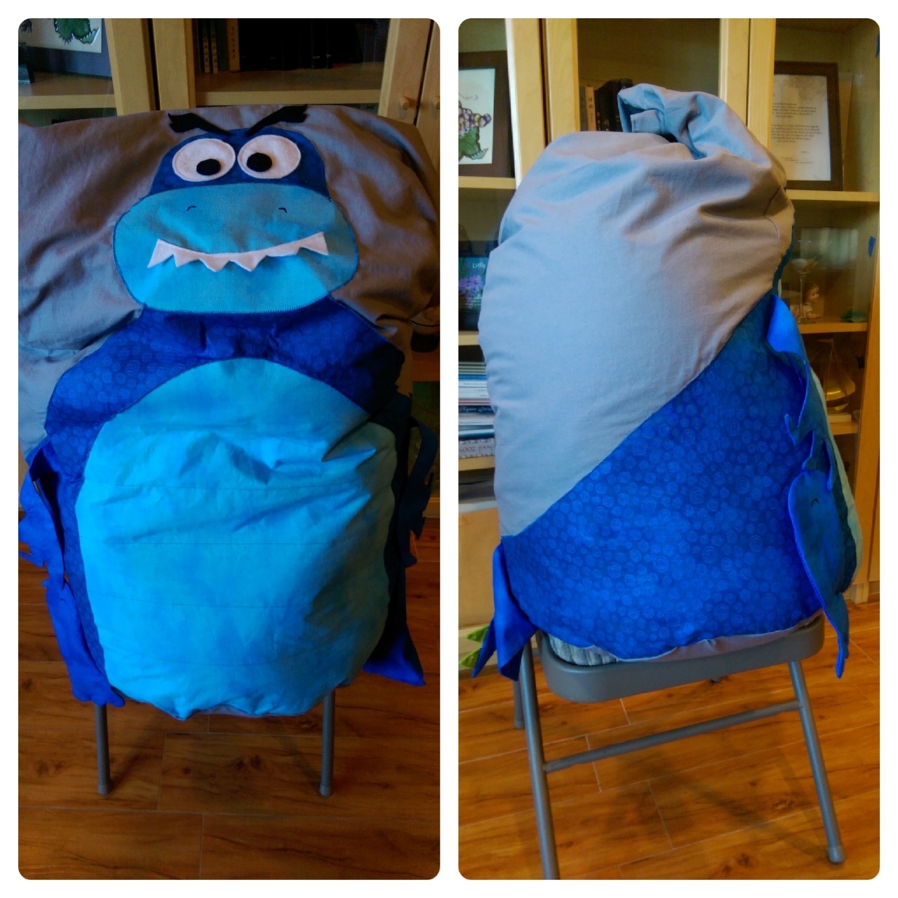 I made her a dino. I don’t remember exactly how I got the idea to make her a blue, toothy dino, but that’s what it turned out to be. Her favorite color is a very beautiful, creamy gray. A bit on a the darker side. I tried to match that as much as possible with the body of the bag. But the dino wanted to be blue. A swirly-patterned blue. He was going to have more green spikes than just on the tail, but I couldn’t fit them in. And when I said that I couldn’t fit them in, I mean that my brain and I were not cooperating nicely and it was really hard for me to get anything completed. I’m either out of practice or there are other things going on which have made my brain decide it’s not going to concentrate on tasks at hand and thus cause me to skip steps in a series of ordered tasks, etc. Maybe it’s both. Whatever. I finished it and it’s been sent off. It turned out ok. Just with fewer spikes than I had imagined.