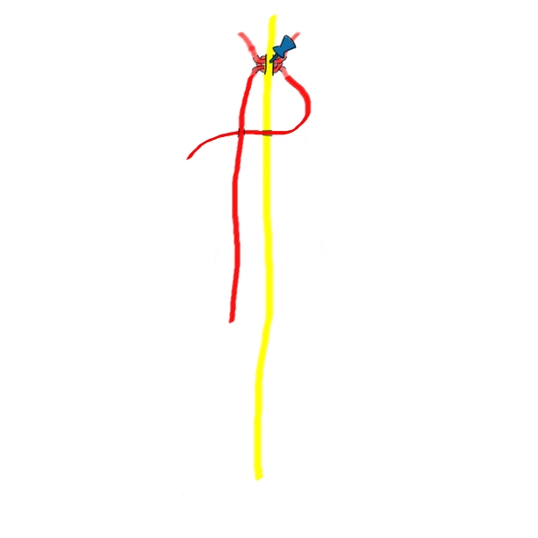 - Place the two handle strings under the core string and you can stick the pin through the core string into the middle of the knot.