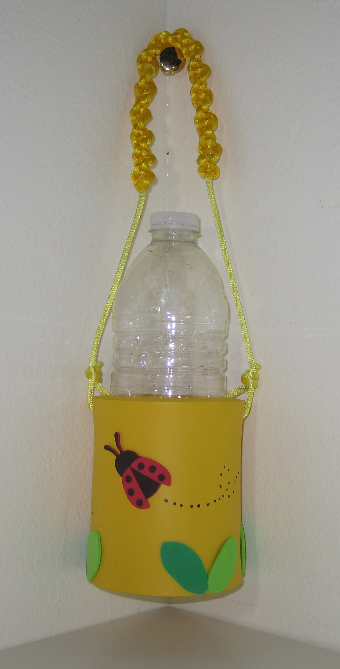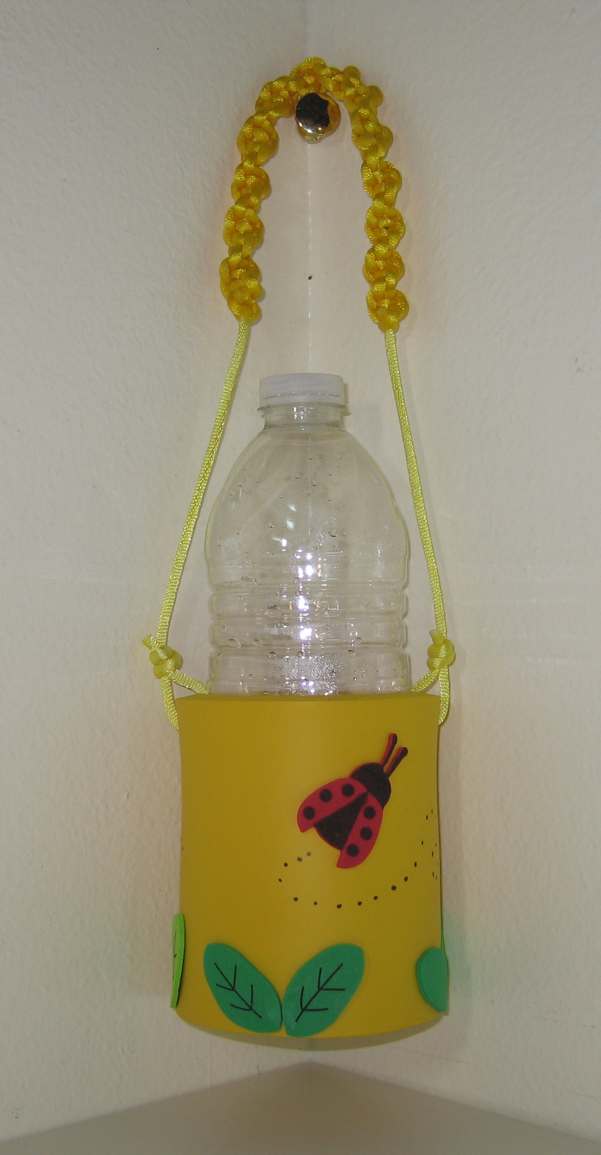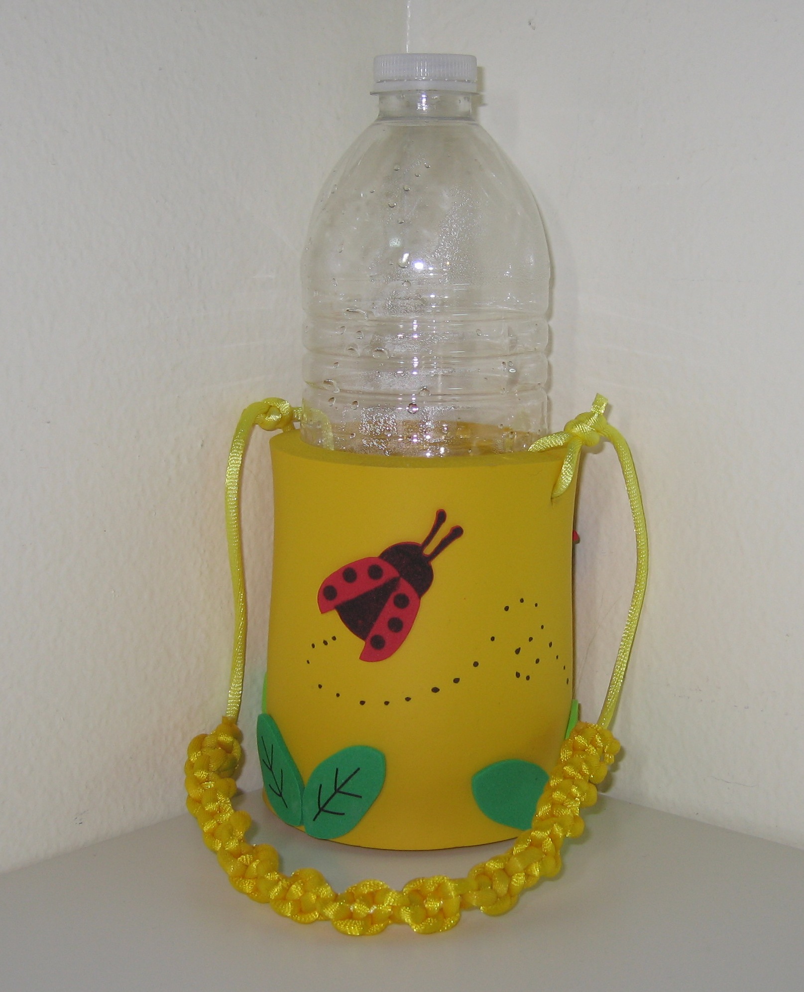 During that time when I was wracking my brain for appropriate kids’ crafts, I came across this idea from Michael’s. It’s a foam bottle holder that requires very little assembly and you can decorate it after. I’m fond of crafts that are useful, so this project definitely had potential. But I felt that it might be a little too easy for the kids I work with. The original design called for just braiding three pieces of ribbon and then using that as the handle. I replaced the ribbon and braiding with Chinese knotting (because I have LOTS of Chinese knotting string) and I had a good (and cost efficient) project for the kids. Tada!