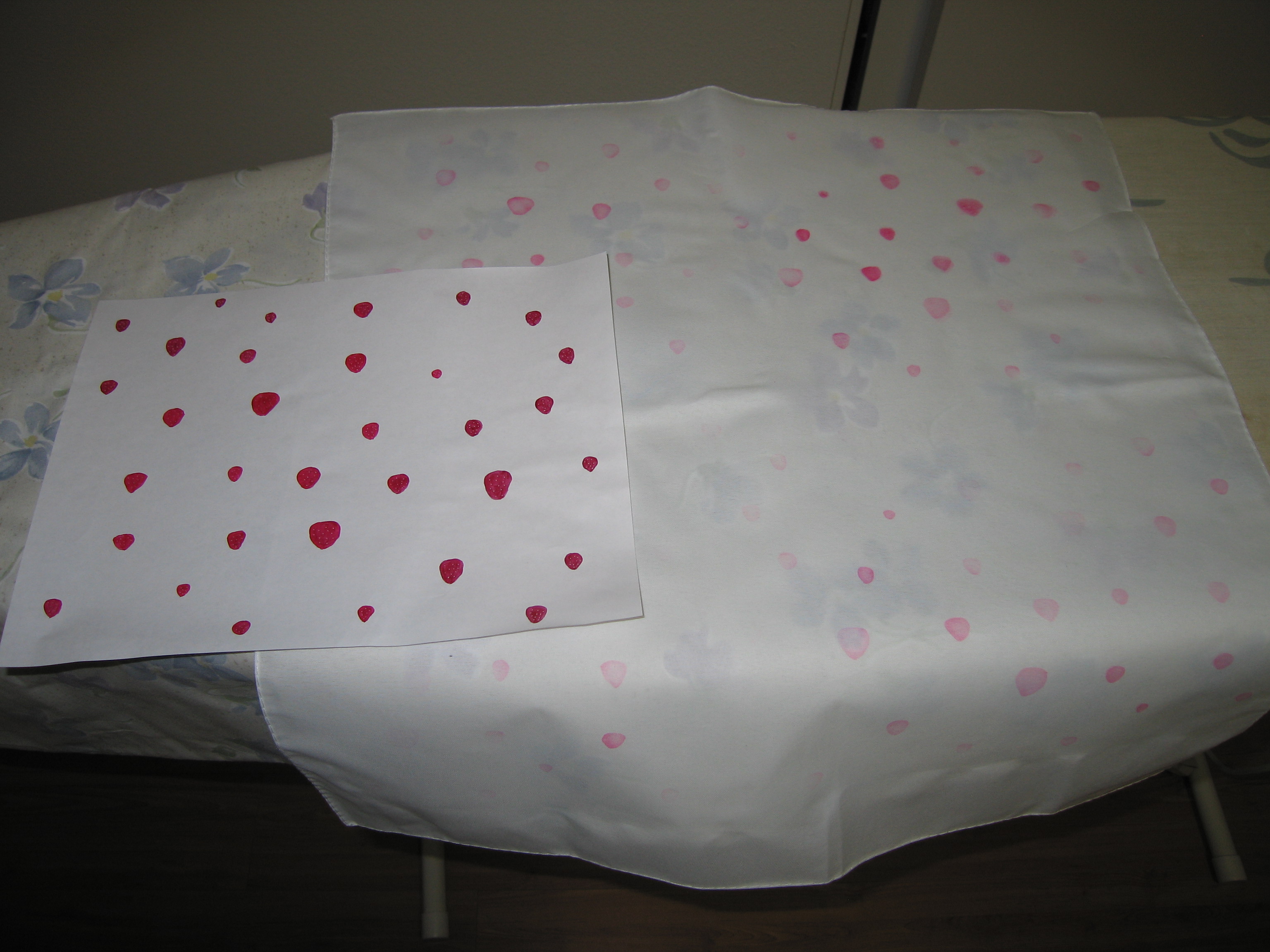 After ironing the pattern onto the cloth, I meant to put the green tops on using a fabric marker. Because remember, I only have a jar of pink. Except…the ink didn’t transfer quite like I was hoping. Looks like I’ll have to work out the kinks before working on an actual project. My first attempt, I thought maybe I had let the ink dry too long. I’ve seen instructions to let it dry between 30-45 minutes. It was actually a few days before I got to ironing the first time around. The result wasn’t even and generally didn’t transfer much by way of color. The second time, I let the ink dry for about 30 minutes and then I ironed it onto the other half of the cloth. Approximately the same results. Soooo…I’ll have to work on this. I have grand ideas for this strawberry print.