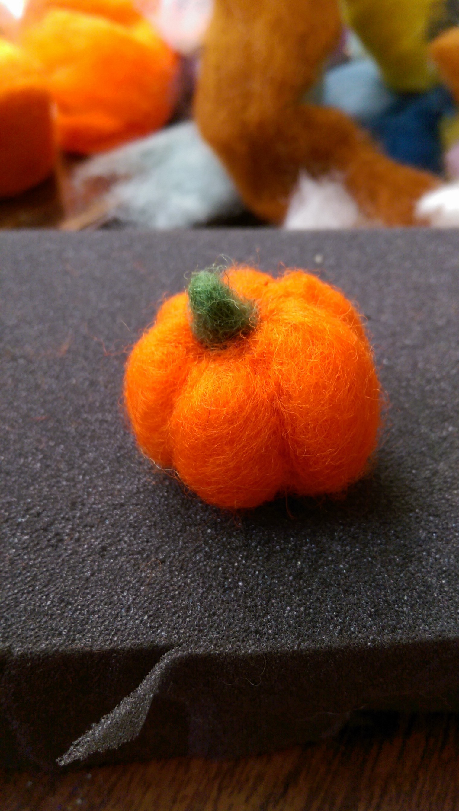 Too much going on. Here’s a needle felted pumpkin I made with the younger kids last week. I only had boys last week and they were all very intrigued by needle felting. I just had to stress to them that 1) stabbing yourself hurts, so be careful, 2) stabbing others hurts and will not be tolerated and I will take away their project if it happens, so be careful, 3) the needle can break and fly up and hit you if you aren’t careful, so be careful, and 4) be careful. It went fine.