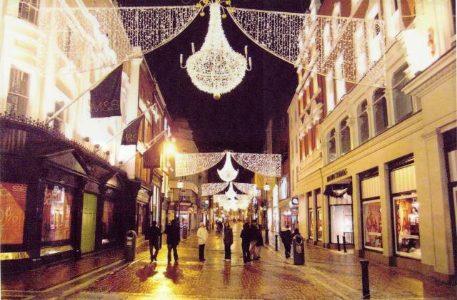 I decided to make these postcards using some photos I took when I visited Dublin, Ireland a few winters back. The first one is of Dublin Castle. It is the most colorful castle I’ve ever seen. But only parts of it. Some parts are not “restored” and look much like you imagine a castle should look. And then you have these splashes of color. It’s really interesting. The other postcard is of Grafton Street, which is the place where everyone does their shopping. I thought it was one of those tourist trap shopping areas at first, but I was told that everyone really does do their shopping there. Since I was there over the holidays, it was decorated with lights and the like. Some of the kids I was visiting had made it a tradition to see the lights late at night, when the street is more or less deserted. They kindly took me along with them.