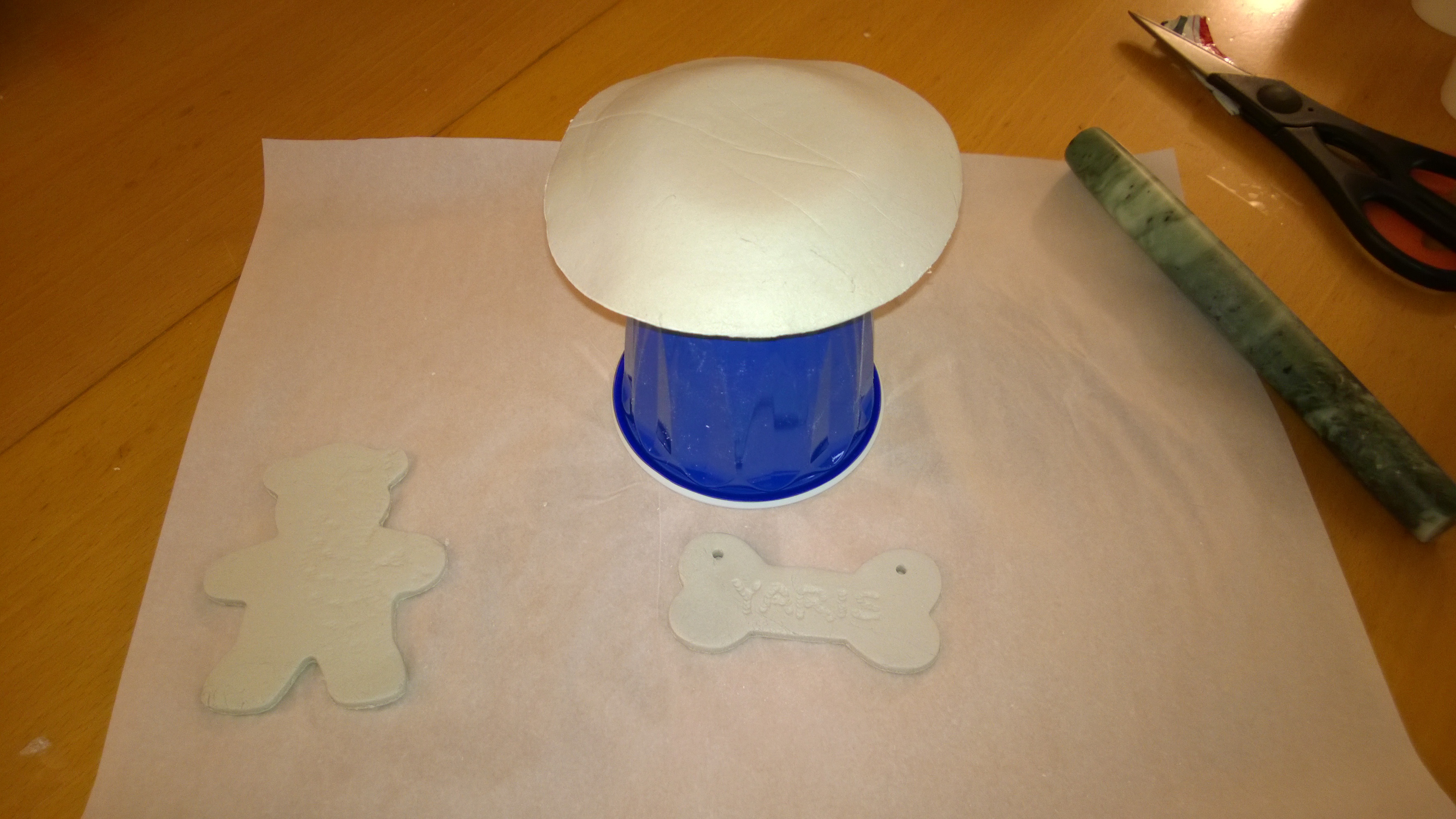 There was plenty of clay for three largish dishes. I opted to make a rather shallow, flat dish. I was thinking that it could house my keys while they’re not actively in use so I don’t have to hunt all over my desk for my keys. I’ll just look in the dish. Um…here is my dish upside down on a cup because I didn’t want a plate or a tile. You’ll note that with my semi-dry lump of clay (I took the driest part because why would I give that to someone else?) I was still able to make a dog bone pendant and this weird bear thing I have no use for. One of my girls very kindly brought out some cookie cutters from her collection for us to use. Also, I brought my stone rolling pin because it’s easier to clean than a wooden one and I didn’t want to eat clay later on.