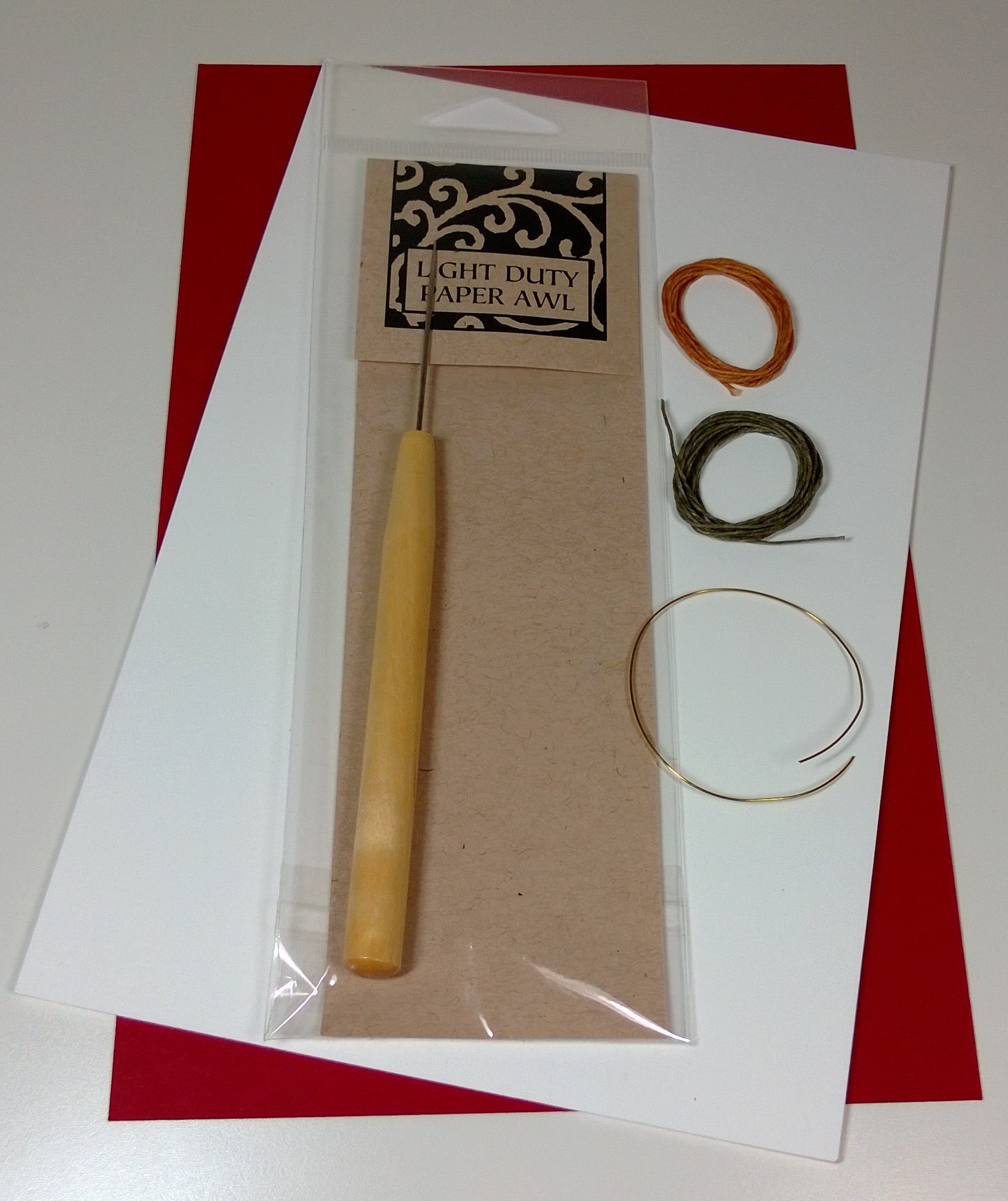 So, in the box were a cardstock cover for the notebook, eight sheets of paper, a small assortment of waxed twine, a small paper awl, and…a length of wire? That maybe is supposed to be a needle? At least, the instructions mention a needle and the only thing I had left in the box was this length of wire. I’m really not sure what it was for. It’s too short to use as binding material. It really doesn’t make a very good needle since it’s just wire. I actually had to email Whimseybox about that. And…I got the fastest response ever (EVAR!) to my question. Turns out the wire can be used to sew (I haven’t really figure out how) but a needle was indeed left out of my box (which they’ve sent to me).